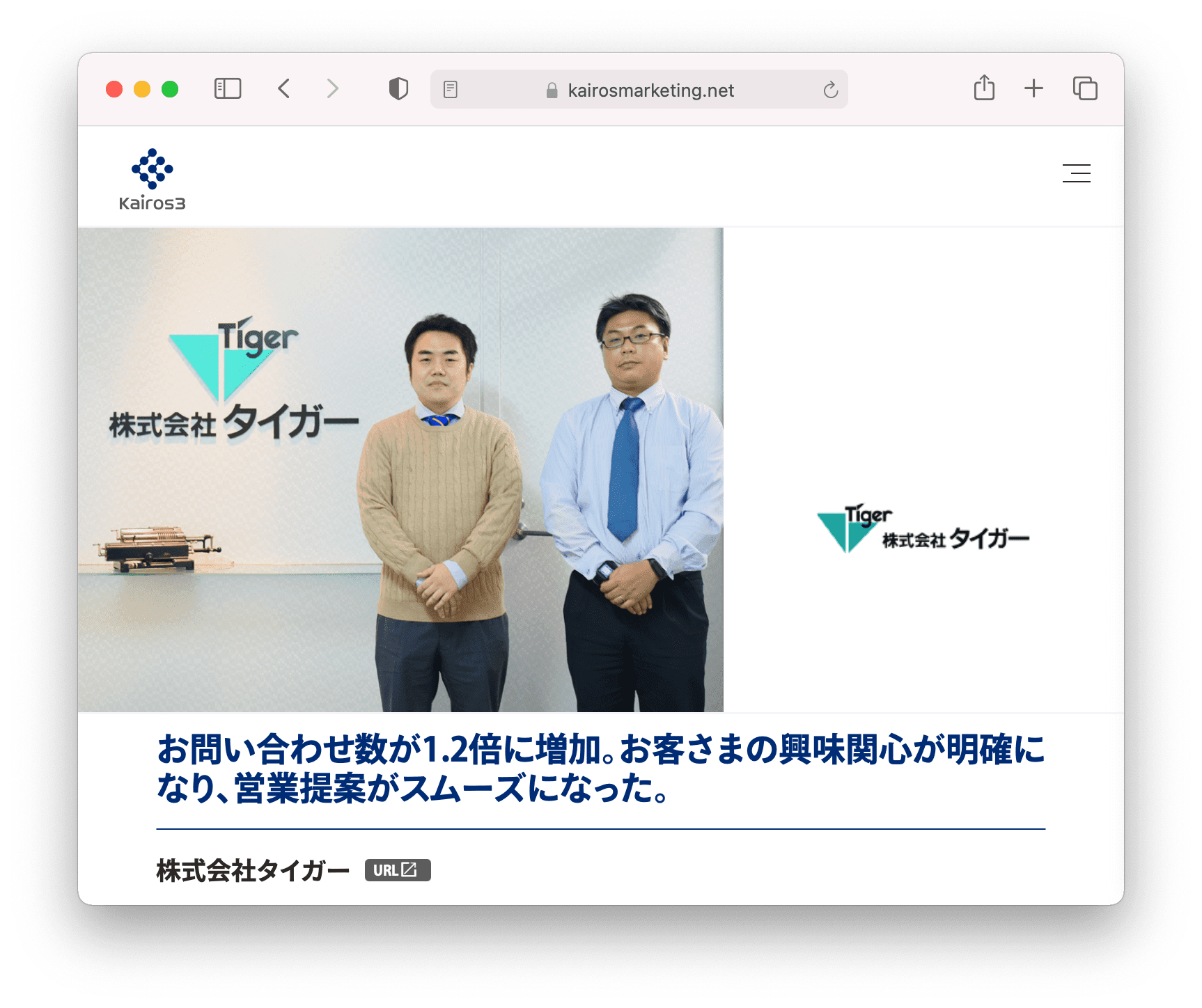 マーケティングオートメーション(以下、MAツール)「Kairos3」を提供するカイロスマーケティング株式会社(本社:東京都渋谷区、代表取締役:佐宗 大介、以下「カイロスマーケティング」)は、株式会社タイガーさま(本社:東京都千代田区、代表取締役:茂岡 賢明、以下「タイガー」)の「Kairos3」導入事例を公開したことをお知らせします。